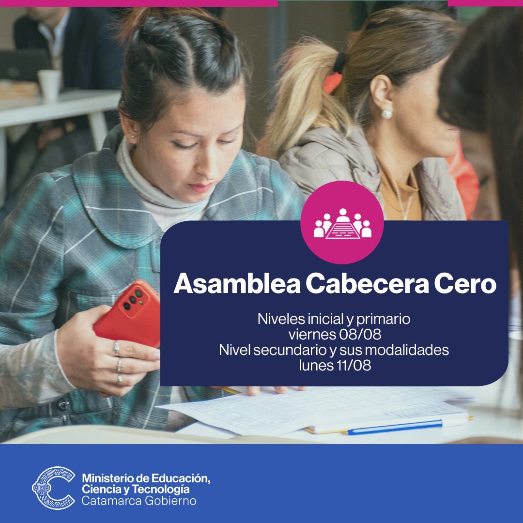 El Ministerio de Educación de Catamarca informó la realización de la 1° Asamblea de Cabecera Cero, destinada a la cobertura de cargos interinos y suplentes declarados desiertos en los niveles inicial, primario, educación especial y adultos primario.