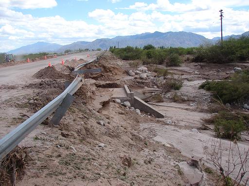 “Este cauce –agrega el informe- estuvo mucho tiempo inactivo concentrándose todo el flujo por el Río Quimivil”, aunque “en la última crecida el Río Huayco recibió importantes aportes pluviales de manera que la sección de las alcantarillas existentes resultó insuficiente, desbordándose el flujo de agua, que pasó por encima de la calzada de la ruta 40 y produjo importantes socavaciones del terraplén del camino”.