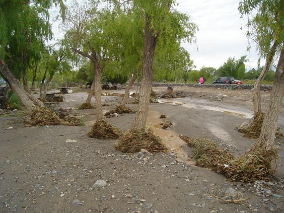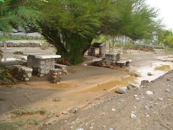 La costanera con todo su camping quedó totalmente inundada, mesas destruidas por la fuerte creciente que llegó en horas de la madrugada de ayer y un murallón que impidió el paso del agua hacia los terrenos que están ubicados en la parte Este de la costanera.