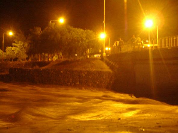 Los bomberos desde las 23.30 aproximadamente comenzaron a trabajar en los barrios El Cerrito, Sacramento, algunas viviendas en la calle cabo Marcial y vecinos del barrio 80 viviendas en el sector norte de esta ciudad pusieron en conocimiento a nuestro medio aproximadamente a las 00.30 que los ríos secos de la zona noreste estaban crecidos tal como se aprecia en la foto.