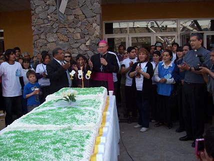 Antes de la celebración penitencial y de la Santa Misa, el Obispo Diocesano, Mons. Luis Urbanc, cantó con los presentes el cumpleaños feliz y partió la gigantesca torta de los cien años de vida de la Iglesia catamarqueña.
