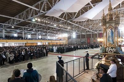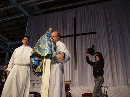 En el predio ferial, aguardaba una gran cantidad de peregrinos, provenientes del interior diocesano y de la misma Capital. La entrada de las Imágenes al salón principal se realizó en un clima de fiesta total, que se hizo más intenso con la presencia de la bendita Imagen de la Virgen del Valle, portada por el Arzobispo de Salta, Metropolitano de la Región NOA, Mons. Mario Antonio Cargnello.