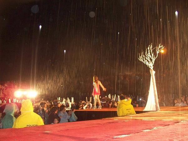 Uno de los números centrales de la noche fue la presencia de Ximena Capristo, quien a pesar de las inclemencias climáticas subió al escenario y desfiló debajo de la lluvia con simpatía, carisma y un profesionalismo digno de destacar.