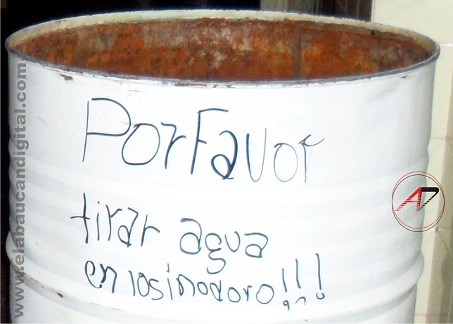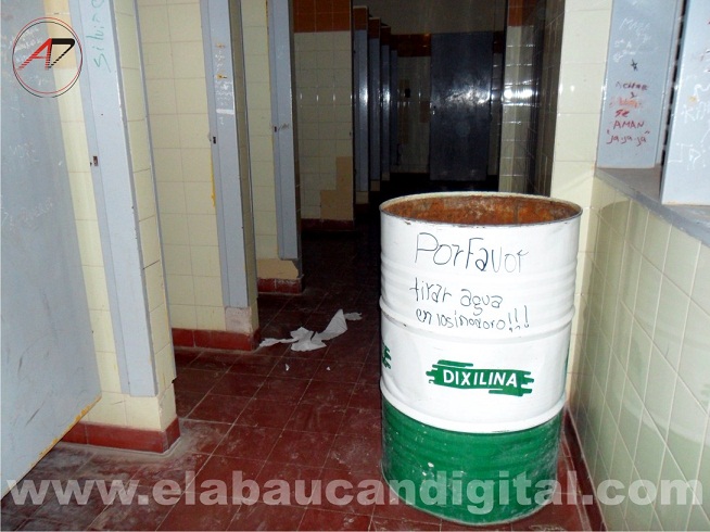Como muestra la imagen, en los baños de la Escuela N° 224 del B° Centro de Fiambalá, existen “tachos” de 200 lts. Con agua que a través de baldes los alumnos deben volcar cada vez que tienen necesidades fisiológicas.