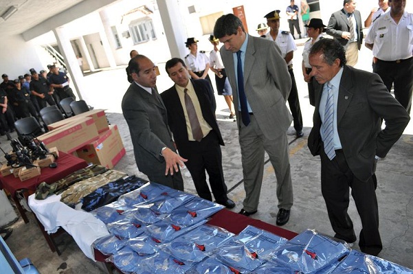 En el playón de la Jefatura de Policía, se hizo entrega de 204 uniformes para el personal policial que desarrolla labores en dependencias que funcionan dentro de la órbita de la Dirección de Unidades Especiales y del interior provincial, dos aires acondicionados, una cocina industrial, 32 sillas de PVC y una heladera, que fueron adquiridos con fondos financieros de la Provincia. Además, se entregaron uniformes y un móvil policial.