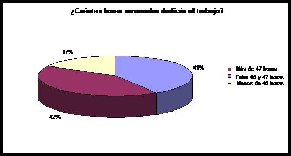 A la pregunta “¿Cuántas horas semanales dedicás al trabajo?”, solo el 17% de los encuestados respondió que le dedica 40 horas, lo que equivale a 5 jornadas semanales de ocho horas cada una. El 41% restante, respondió que pasaba entre 40 y 47 horas de la semana trabajando.