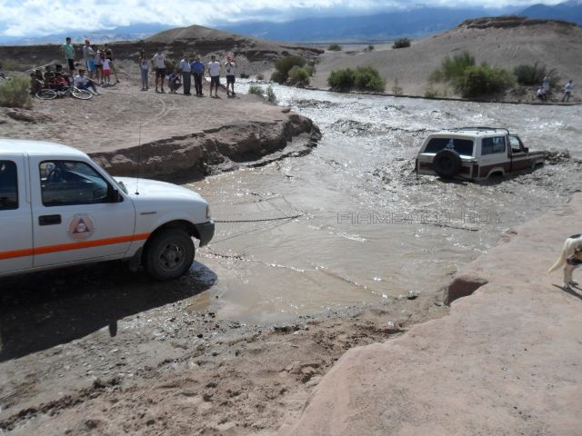 Similar situación pasó en horas antes de este suceso, cuando una pick Up marca Toyota, también procedente de Fiambalá, cruzó el rio, valiéndose de su suerte logó salir con algunos daños en su paragolpes trasero.