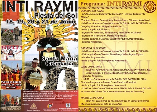 - 14:00 Hs. Puesta en escena IV Edición INTI RAYMI 2011 “Una Fiesta a Recuperar y Recrear” – Anfiteatro Municipal.