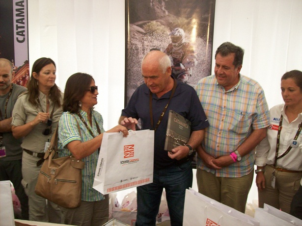 En la carpa, además, se realizó la entrega protocolar de presentes, encabezada por la Gobernadora Dra. Lucia Corpacci y la secretaria de Turismo Natalia Ponferrada, a las autoridades nacionales que llegaron a presenciar el Dakar y miembros de la organización. Hasta allí llegaron el Ministro de Turismo de la Nación Enrique Meyer, el Secretario Ejecutivo del INPROTUR Leonardo Boto, el Subsecretario de Planeamiento Estratégico Juan López Chorné, el representante de Argentina en Francia Carlos Feenig y los integrantes de la ASO Anthony Murac y María Noel Maina, quienes recibieron el libro Catamarca Te Invita del fotógrafo Néstor Domínguez y productos artesanales. También recibieron presentes los intendentes de los municipios de Fiambalá, Tinogasta, Londres y los pilotos catamarqueños Walter D´agostini y Diego Demelchori. Para cerrar los artistas, enviados por la secretaria de Cultura, Rafael Toledo, Noelia Tula, Leticia Aranda y los copleros de Fiambalá realizaron un repertorio netamente catamarqueño para los presentes.
