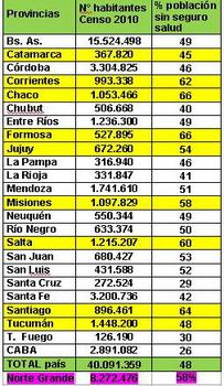 El estudio fue realizado en base a los resultados del Censo de Población, Hogares y Vivienda de 2010 y del Ministerio de Salud de la Nación. Los datos en los que la OPS basa su análisis sobre Argentina, que dieron a conocer en nuestra provincia, Catamarca, el 45% de la población no tiene obra social, mientras que el promedio nacional de población sin seguro de salud es de 48%, lo que representa a más de 19 millones de personas. En tanto, en seis provincias argentinas hay más del 58% de la población sin ningún tipo de seguro de salud.