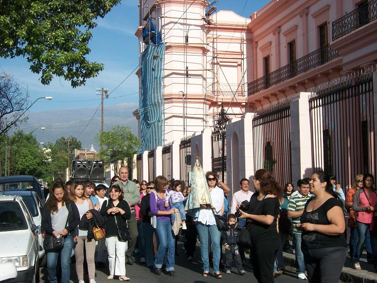 A las 8.30, la Sagrada Imagen partió desde el Santuario y Catedral Basílica portada por los papás de los alumnos del colegio privado, abarcando el trayecto de calle San Martín hasta la institución escolar, donde la esperaban autoridades, docentes, alumnos y demás personal.