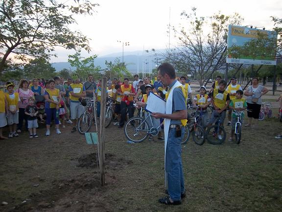 Seguidamente, el grupo se trasladó hasta el anfiteatro del Parque de los Niños, donde se procedió a la entrega de plantines de olivos a cada participante de la bicicleteada, donados por la Municipalidad de la Capital, tarea realizada por un grupo de jóvenes de la comuna local.