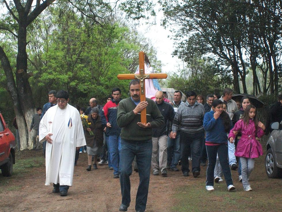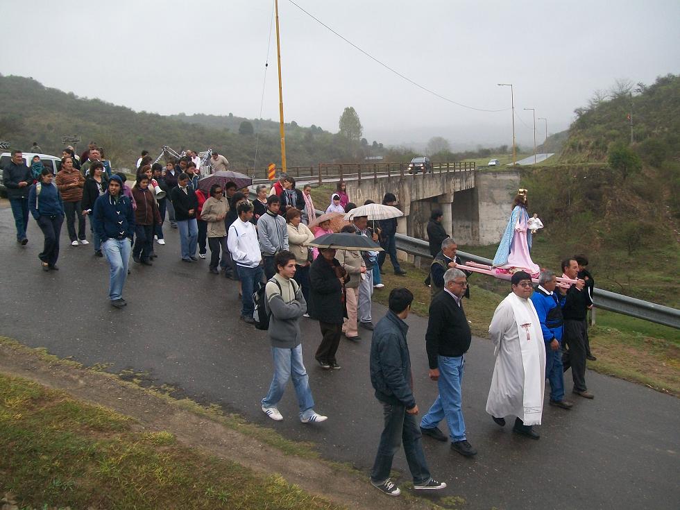En horas de la tarde, la comunidad homenajeó a su Santa Patrona con una procesión, presidida por el Párroco, Pbro. Sergio Chumbita, que se desplazó desde la gruta ubicada sobre la ruta, en la entrada del pueblo, hasta la capilla. Fieles de todas las edades caminaron los cinco kilómetros de distancia rezando y cantando bajo la lluvia. Se rezó el Santo Rosario, poniendo como intención especial la familia, en el Año Diocesano de la Familia.