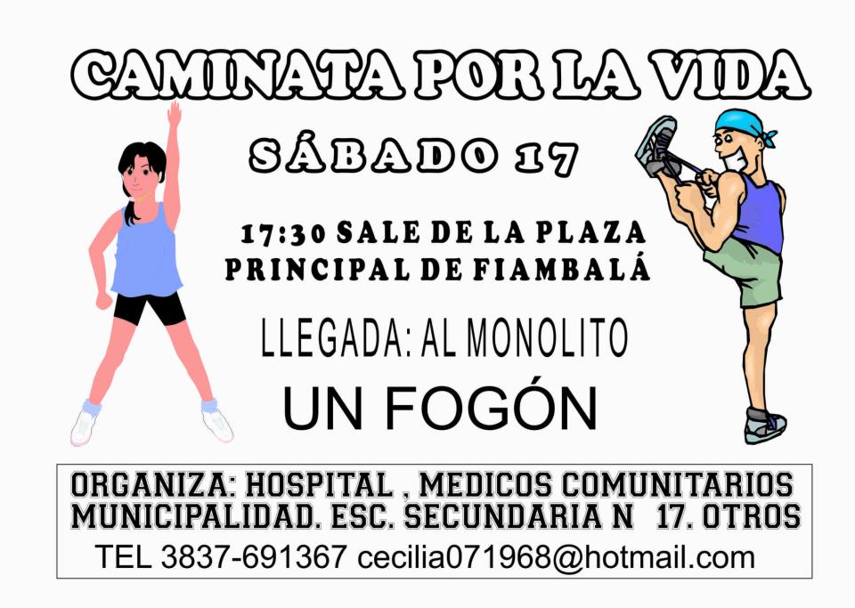 “Caminata por la vida” se iniciará a partir de las 17.30 horas de el próximo sábado 17 y el lugar de partida será la plaza principal de la localidad de Fiambalá para finalizar en el monolito. También están previstas otras actividades, tales como un fogón y charlas donde se compartirán experiencias.