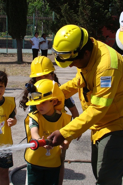Durante el simulacro, los niños de la Salita “E” de la Quintana pudieron tirar agua con una motobomba, hablar por radio con los brigadistas, jugar con “Monti” el cóndor mascota de la brigada y otras actividades que hacen a los cuidados del medio ambiente de nuestra provincia.