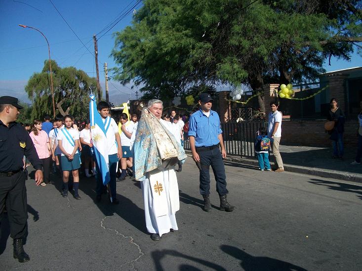 Desde la sede donde funcionan las salas del Jardín de Infantes de la institución educativa, fue llevada en procesión hasta el edificio escolar donde funcionan los otros niveles educativos. En el trayecto fue escoltada por los agentes de Tránsito de la Municipalidad de Valle Viejo y efectivos de la Policía de la Provincia, mientras las sirenas anunciaban su paso por las calles de la ciudad chacarera.