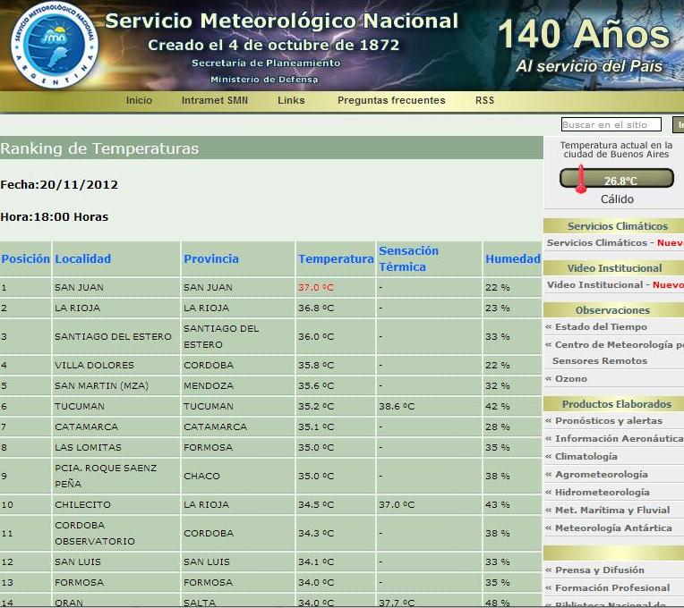 El ranking nacional de temperaturas elaborado por el Servicio Meteorológico Nacional ubicó a Catamarca en el séptimo lugar, con una máxima que llegó a los 35,1°. El primer lugar fue para San Juan, donde el termómetro llegó a los 37°. La Rioja fue segunda, con 36,8°. Conozca las ciudad más calientes en el día de hoy.