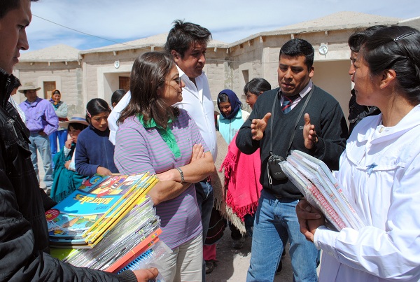 “Esto es histórico para nosotros”, dijo la directora Macías, “ya que nunca antes había llegado otra autoridad más que una supervisora de Educación, y este año ya había estado el ministro de Desarrollo Social, Oscar Pfeiffer”. Con el Ing. Marcelo Murúa y el Arq. Willima Contreras, ambos pertenecientes al Ministerio de Obras Públicas, la mandataria recorrió las instalaciones y se interiorizó en los trabajos de la reparación y ampliación del albergue, y otras dependencias que se ejecutan a través de personal de la mencionada cartera. Asimismo, se entregaron pabellones de ceremonias, tanto de la Bandera Nacional como de la Provincia de Catamarca, con asta de madera y banda, kid escolares, material didáctico, manuales de Ciencias Sociales para 4to., 5to. y 5to. Año del Nivel Primario de autoras catamarqueñas, además de golosinas y otros comestibles.
