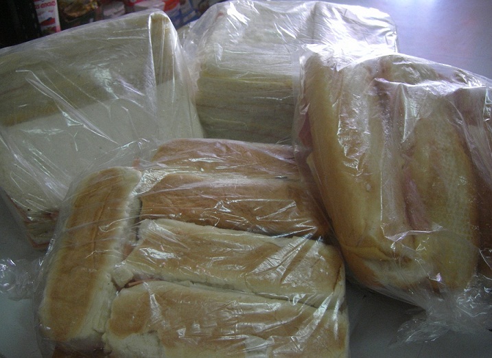 Pebetes de fiambres descoloridos, sin refrigerar (fuera de la heladera), aún cubiertos en campanas de plástico y envueltos en film en kioscos, sin etiqueta de origen ni fecha de elaboración y envasado.