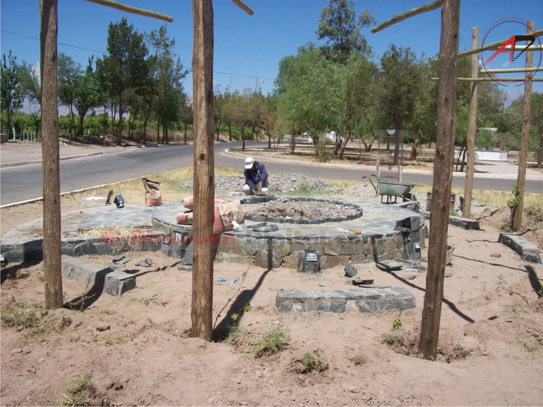 Desde la Secretaría de Obras y Servicios Públicos se trabaja en la construcción de la base que será hecha de piedra de la zona, que al finalizar tendrá un llamativo diseño que será apreciado por quienes ingresen a esta ciudad y de esa manera sepan que el trabajo del viñatero es una de las principales actividades agropecuarias de la Región.