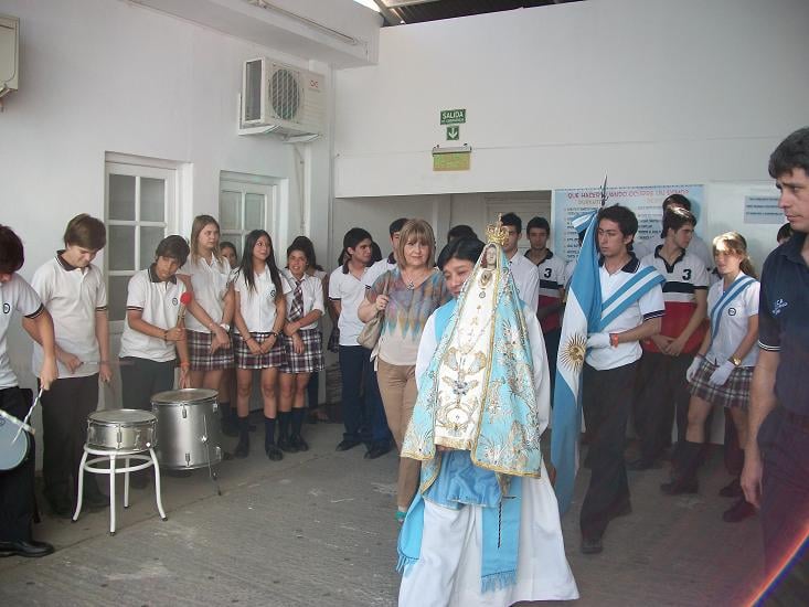 Al paso del Pbro. Eugenio Pachado, encargado de llevar a la Virgen Peregrina, y escoltado por las banderas de ceremonias, portadas por sus abanderados y escoltas, todos los alumnos formaron un cordón para acompañarla hasta el salón de actos preparado para recibirla. Allí tuvieron lugar las palabras del Padre Pachado, quien les contó a los jóvenes que la Virgen llegaba hasta su colegio para invitarlos a participar de las fiestas marianas desde el 29 de noviembre. Grata noticia que deben transmitir a sus familias.