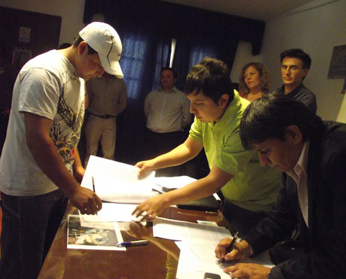 Representantes de las cuatro cooperativas del distrito, más la de la localidad de Palo Seco, escucharon atentamente los mensajes del intendente y de las autoridades de la Secretaría de Vivienda, respecto del compromiso que asumen y de los beneficios que obtendrán a partir de la rúbrica de estos contratos que le permitirán a casi un centenar de personas, incorporarse como mano de obra directa en la construcción de los 43 módulos habitacionales y los baños que se construirán en el marco de este plan