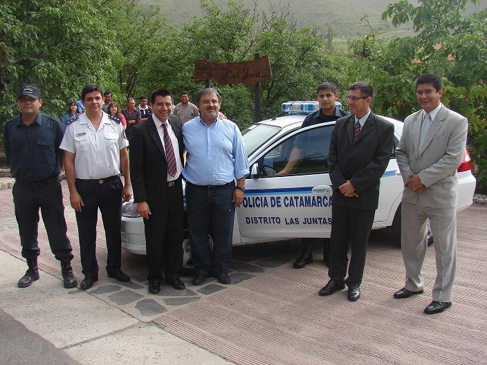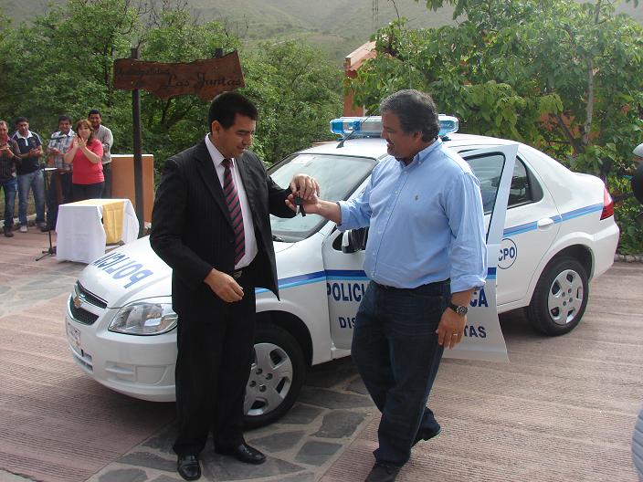 La entrega del vehículo, por parte del intendente comunal Jorge Herrera, se hizo efectiva frente a la sede municipal, donde además del ministro de Gobierno y Justicia, Francisco Antonio Gordillo, se dieron cita el subsecretario de Seguridad, Juan Pablo Morales y el Jefe General de la Policía Provincial, Juan José Palomeque. Los mencionados funcionarios provinciales, junto al titular de la comisaría de El Rodeo, Oficial Inspector Sergio Alejandro Mamaní, fueron los encargados de recibir la unidad, un moderno Chevrolet, modelo Prima 1.4, LS, tipo sedan, 4 puertas, 0 Km., equipado con radio, sirena, balizas y jaula de contención, que de inmediato pasó a disposición de las autoridades policiales de la jurisdicción. La flamante unidad fue adquirida por la Municipalidad de Las Juntas con aportes del Fondo de Desarrollo Municipal (FDM).