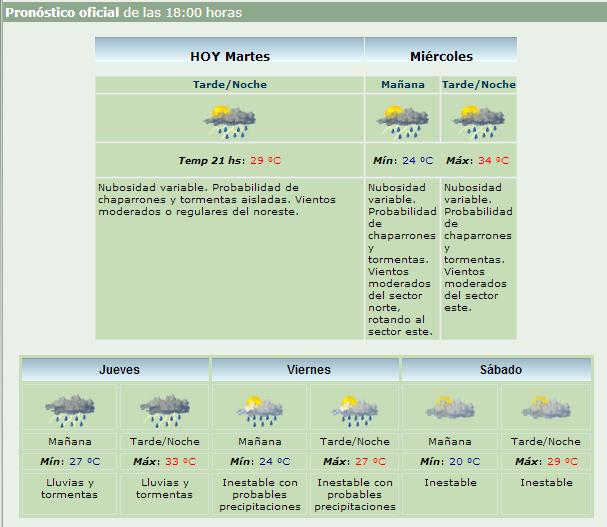 El cielo catamarqueño no anticipa, al menos hasta esta hora, la posibilidad de lluvias y tormentas. Sin embargo, el pronóstico extendido del Servicio Meteorológico Nacional, muestra para hoy, mañana, jueves, viernes y el sábado, tiempo inestable con altas probabilidades de precipitaciones. Hacia el sábado la temperatura máxima será de 29°, bastante menos que las registradas en los últimos días. Conozca cómo estará el clima.