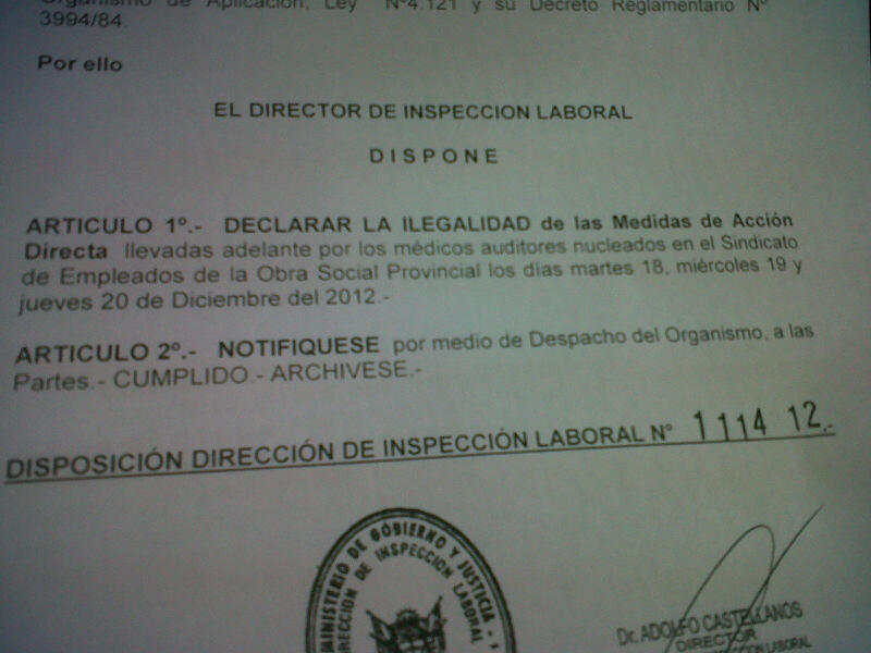 Las medidas de fuerza llevadas adelante por los médicos auditores de la Obra Social de los Empleados Públicos los días martes 18, miércoles 19 y en la jornada de hoy jueves 20 fueron declaradas como ilegales por la Dirección de Inspección Laboral, por lo que el organismo ya fue informado al respecto.