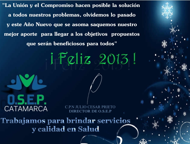 El Director de la Obra Social de los Empleados públicos, CPN Julio Prieto, y su equipo de trabajo saludan en estas Fiestas de Fin de Año a quienes tienen la noble labor de informar diariamente a la ciudadanía. Les deseamos un 2013 con prosperidad, trabajo y felicidad.