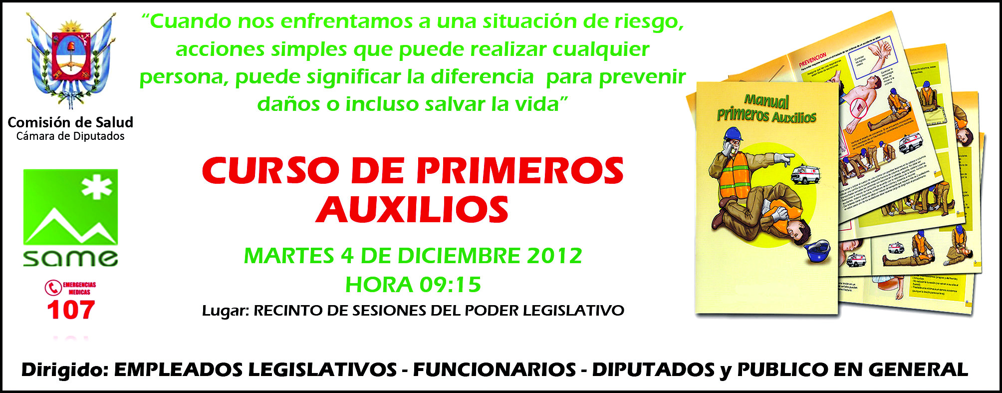 La Cámara de Diputados de la provincia, en conjunto con la Comisión de Salud, invita para hoy a empleados legislativos, funcionarios, diputados y público en general a un curso de primeros auxilios. La cita es a las 9.15 horas en el recinto de sesiones “Fray Mamerto Esquiú” de la Legislatura Provincial.