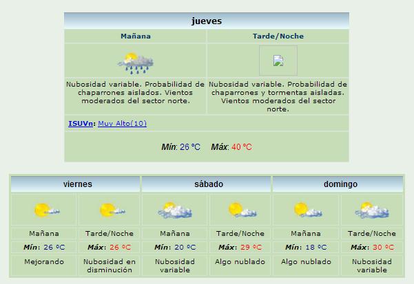 Según el pronóstico extendido del Servicio Meteorológico Nacional, existen bajas probabilidades de lluvia; aunque se puede apreciar un importante descenso de la temperatura, cuya máxima no superaría los 30° el domingo.