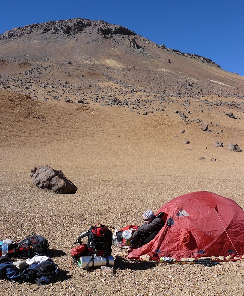 Las condiciones duras del campamento incluían sequedad extrema cercana al 0%, muchos grados bajo cero a la noche y alta radiación en el día además de fuertes vientos. El día anterior a terminar la expedición Scanu ascendió el empinado cerro pabellón de 5331 msnm, al borde de otro enorme cráter volcánico teniendo una vista privilegiada al Ojos del Salado (el volcán más alto del Mundo y segunda cumbre de América), muchos otros volcanes, a Chile y hasta Salta. Esa noche sufrieron una intensa lluvia y nevada.