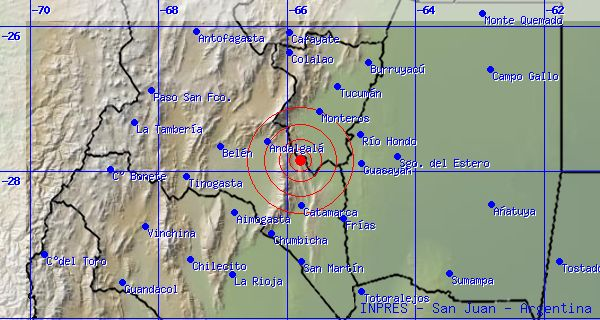 El movimiento telúrico se produjo esta mañana a las 9.34:04, cuyo epicentro se ubicó a 65 Km. al norte de la ciudad de San Fernando del Valle de Catamarca, en la cumbre de Balcozna.