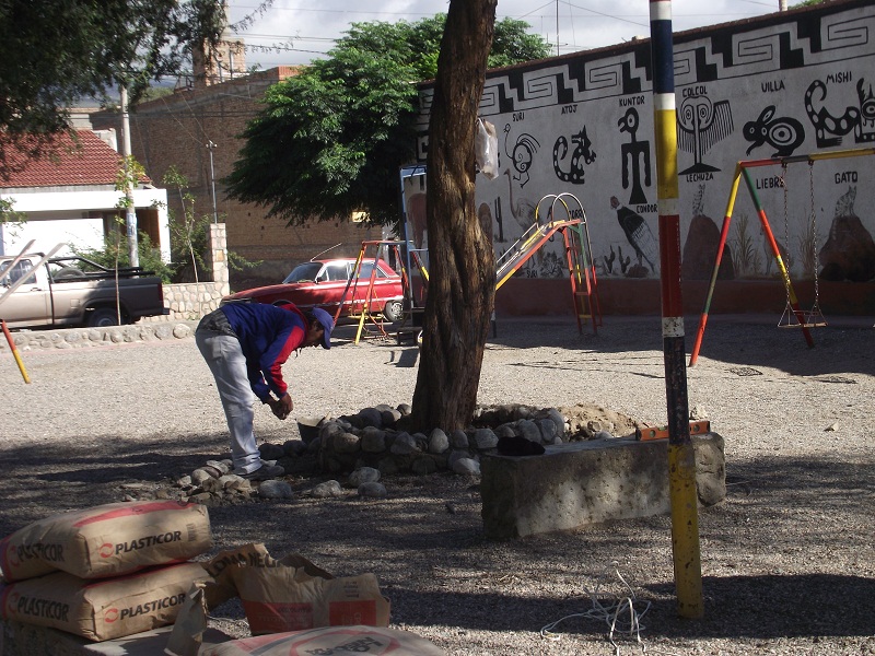 Gustavo Chaile, capataz de la obra, indicó que en esta oportunidad se están realizando tareas de refacción en la plazoleta que incluye la reconstrucción de canteros, construcción de asientos y revoque grueso de una pared. “Estamos trabajando en una pared de un vecino para que quede en buenas condiciones, luego una vez que se concluya con el revoque se lo pintará para luego completar la obra que en su momento realizó el artista plástico Daniel Aciar”, expresó Chaile.