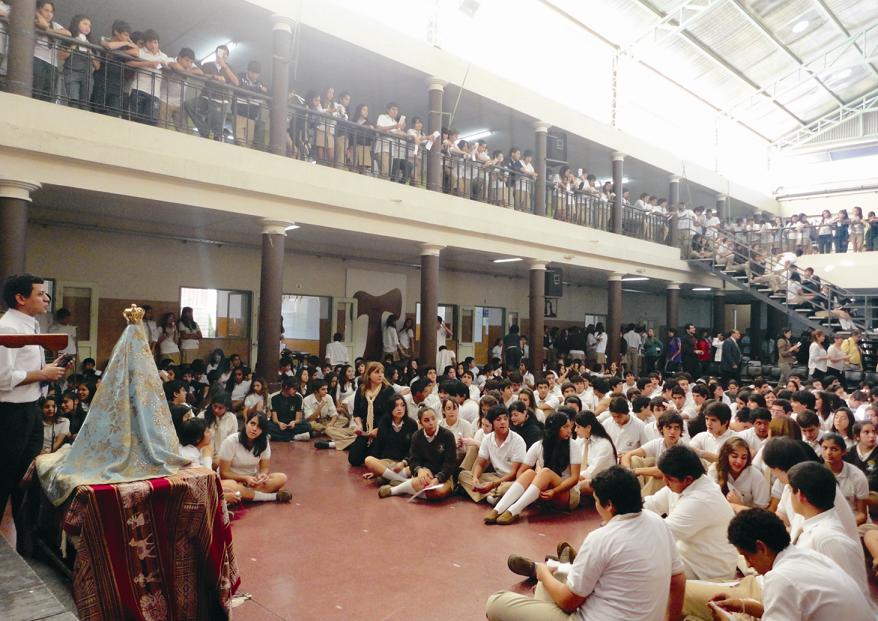 La imagen de la morenita llegó en horas de la mañana traída desde su santuario por los alumnos de 3er. año del Polimodal, quienes en su último año en la institución realizan este gesto, que culminará luego con una consagración.