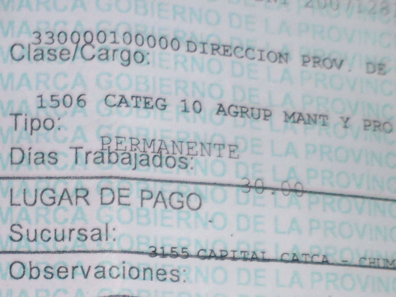 Empleados del Ministerio de Obras Públicas de la provincia recibieron con gran satisfacción recibo de sueldos correspondiente al mes de marzo con la leyenda impresa de “planta permanente", un logro muy importante para agilizar otro tipo de tramites personales.