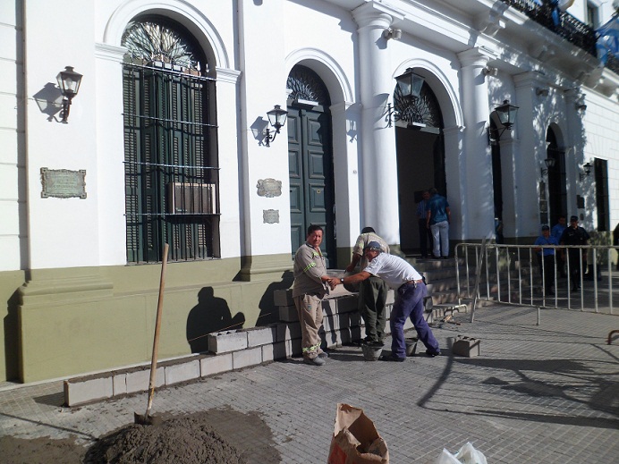 En el ingreso principal de Casa de Gobierno, trabajadores pertenecientes al municipio de la Capital trabajan en la construcción de una rampla para discapacitados.