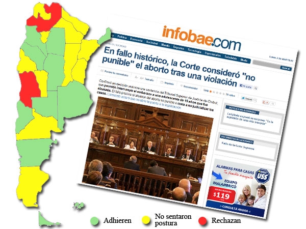 A favor del aborto no punible en caso de violación, que se podrá realizar sin autorización judicial previa, se manifestaron las provincias de Buenos Aires, Córdoba, Tierra del Fuego, La Rioja, Neuquén, Santiago del Estero, Misiones, Catamarca y, por supuesto, Chubut, donde se dio el caso que dio lugar al pronunciamiento de la Corte.