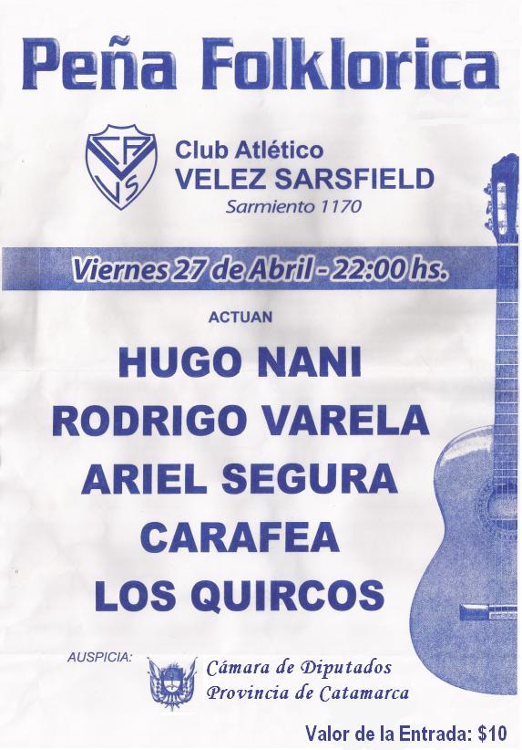 jueves, 26 de abril de 2012 00:00 jueves, 26 de abril de 2012 00:00 Actuarán Hugo Nani, Rodrigo Varela, Ariel Segura, Carafea, Los Quircos, entre otros. El valor de la entrada es de $10. El evento es auspiciado por la Cámara de Diputados de la Provincia de Catamarca.