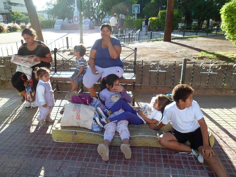 Esta mañana desde las 7 horas, una mujer embarazada y sus tres hijos se instalaron en la plaza 25 de Mayo en un colchón, como símbolo de desidia y de no tener una vivienda para vivir.