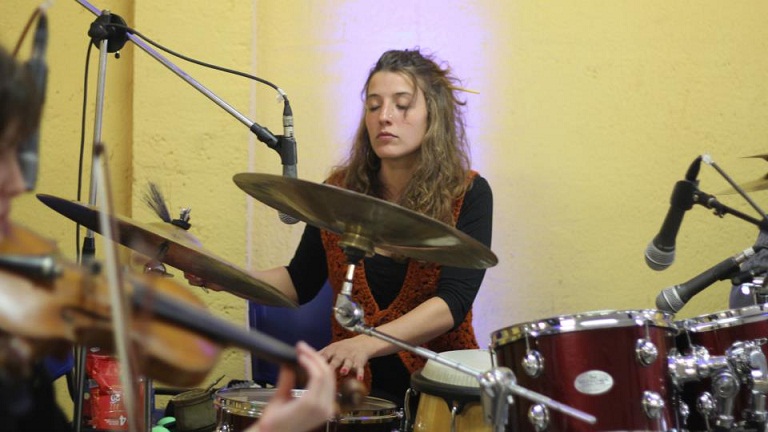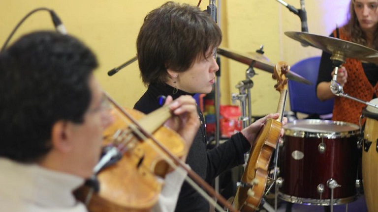 Guitarras, violines, vientos y hasta una batería sonaron en una entusiasta zapada, que luego se integró a los trazos monocromos que los plásticos desplegaron sobre una gran tela. La obra final que resultó de ese esfuerzo colectivo fue un gran aprendizaje como experiencia creativa conjunta, según coincidieron todos los participantes.