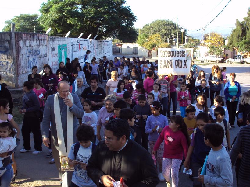 Los catequistas junto con los niños que se preparan para recibir los sacramentos de la Comunión y la Confirmación se apostaron en inmediaciones del principal paseo público del conglomerado y en el atrio del templo, para brindarle una calurosa bienvenida con canciones, aplausos y palabras a cargo de la Sra. Zully Díaz, en representación de los catequistas.