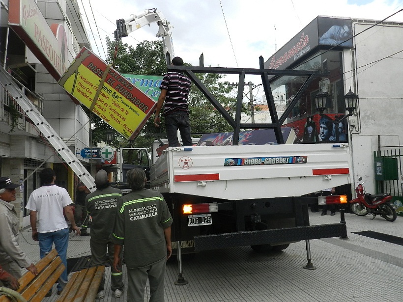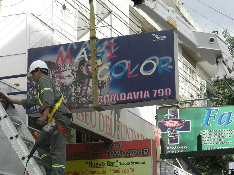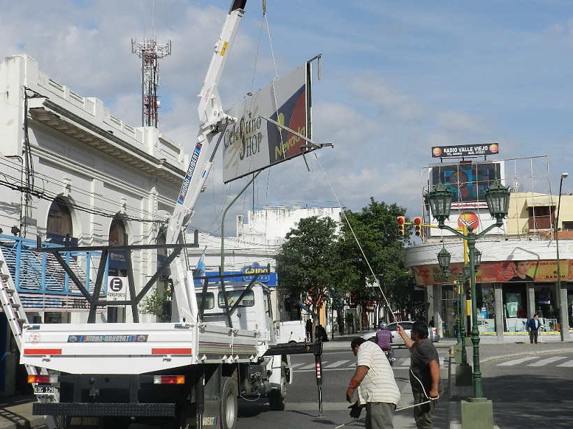 De acuerdo a lo dispuesto en la ordenanza Nº 4721, y en la ordenanza Nº 2040 que regula la actividad en la calle Rivadavia, no se permite ningún tipo de cartelería saliente de la fachada, ni aquellas que tapen la vista arquitectónica de un edificio patrimonial o de interés, la comuna retiró cinco carteles pertenecientes a comercios de la peatonal y a una galería.