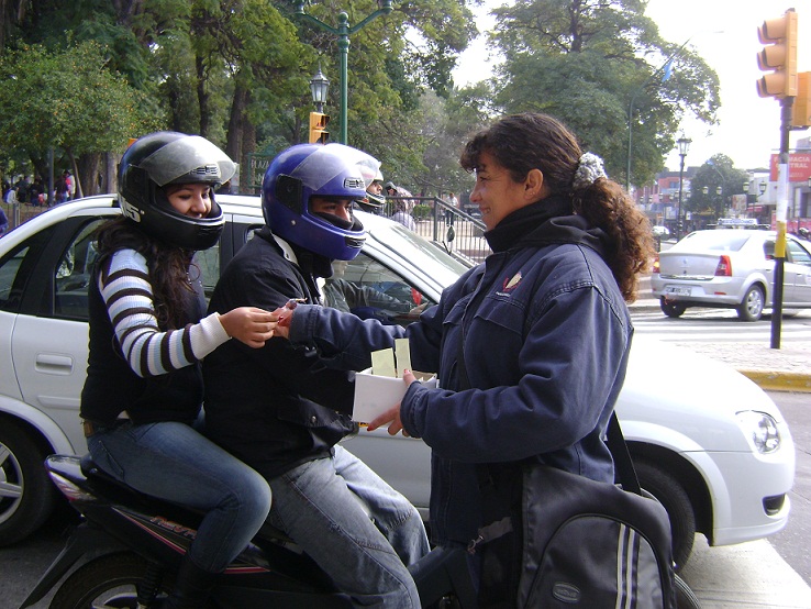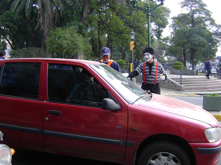El mimo estuvo acompañado de agentes sanitarios y pre ventores de transito municipal, premiando las acciones positivas del peatón y conductores, con la entrega de una golosina con folletería sobre Salud Vial.