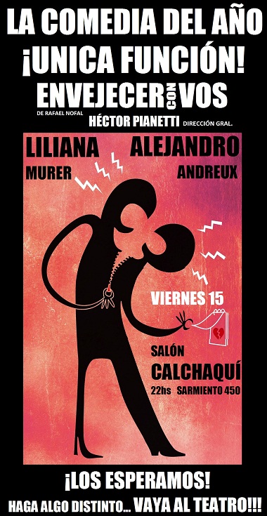 La Cooperativa Artística Cultural “El Taller” presentará este viernes, en el Salón Calchaquí la última puesta en escena obra “Envejecer con vos”, con la dirección general de Héctor Pianetti y las actuaciones de Liliana Murer y Alejandro Andreux.