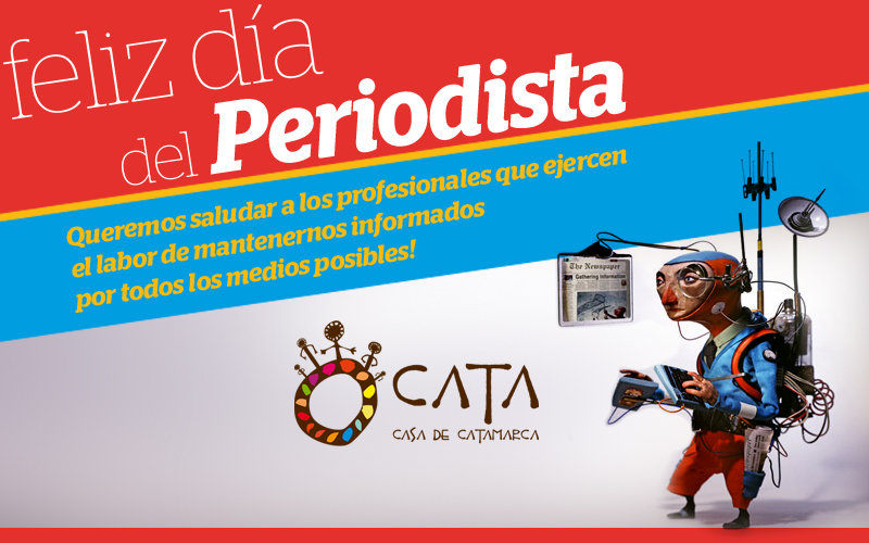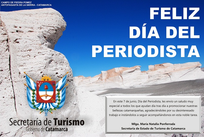 La Comisión Directiva de la Asociación de Hoteles, Bares, Confiterías, Restaurantes y Afines de Catamarca, saluda en el Día del Periodista a todos los hombres y mujeres que integran la Prensa de Catamarca, instándolos a continuar con el compromiso cotidiano de sostener a Catamarca como un destino turístico de nivel Nacional e Internacional.MARIA ANTONIETA CATTARUZZA ROBERTO BRUNELLO