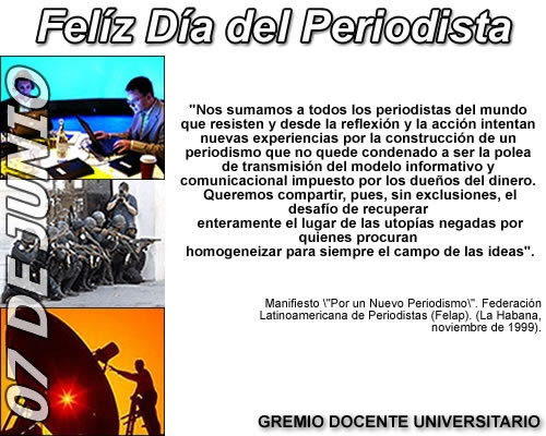 “Felices tiempos aquellos en que se puede sentir lo que se quiere y decir lo que se siente”.... Así rezaba la Gazeta de Buenos Aires creada por Mariano Moreno en 1810, cuando comenzábamos a ser una nación libre e independiente. Hoy, en tiempos de crisis y también de cambios profundos, alzamos votos para que los hombres y mujeres que ejercen la noble tarea de mantener informada a la sociedad, lo hagan con convicción y con la mayor objetividad posible concientes de la influencia que tienen en el destino de una nación. FELIZ DÍA, COLEGAS Y GRACIAS POR ACOMPAÑARNOS EN LA DIFUSIÓN DIARIA QUE LLEVA ADELANTE LA FACULTAD. UN AFECTUOSO ABRAZO Y DIOS Y LA VIRGEN LOS CONSERVE COMO HOMBRES Y MUJERES DE BIEN. Área de Cooperación y Relaciones Institucionales T.S.C.S Esteban Lobo - Fac. de Derecho-UNCa