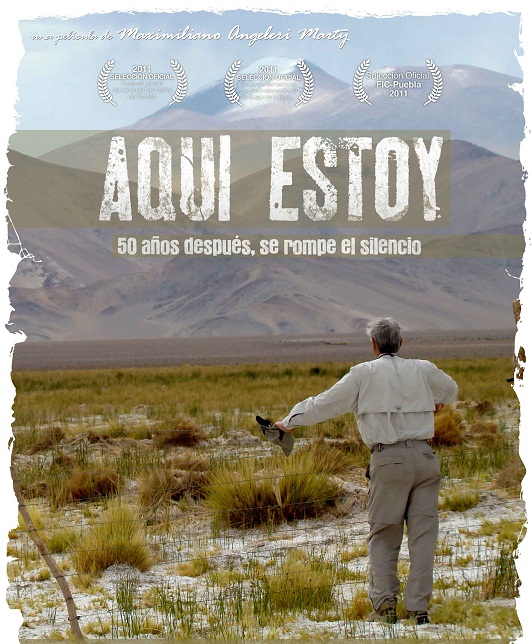 “Aquí Estoy” narra la historia que tiene como protagonista a Alberto Angeleri, quien en el año 1958 participó de la segunda expedición argentina al volcán “Ojos del Salado” de 6.893 msnm, situado en nuestra provincia y catalogado en su momento como el más alto del mundo. Ya a unos 6.800 mts. sobre el nivel del mar se quedó dormido por los efectos de la altura y mientras el resto de la expedición hacía cumbre. Despertó totalmente desorientado y cayó por los hielos de un glaciar. Caminó perdido durante días arrastrándose con los pies congelados, sin comida ni agua y con temperaturas de aproximadamente 20°C bajo cero. Sufrió alucinaciones, sintió que se moría, pero nunca dejo de luchar. Y mientras los diarios del país decían que el triunfo de la expedición se había cobrado la vida de un andinista, después de 12 días perdido, apareció con vida en la base de la montaña desmayándose a los pies del hijo de un arriero. Pasaron 50 años de silencio y éste hombre de 77 años decide subir a la montaña nuevamente para festejar su cumpleaños y contar la historia que guardó durante tanto tiempo… Su lucha por sobrevivir.