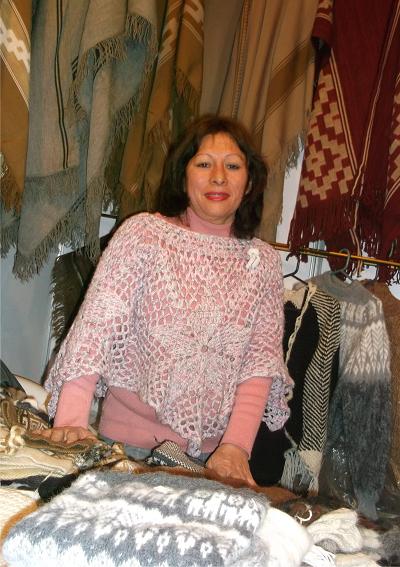 Alicia, desde que tiene uso de razón, ha tejido ponchos de alpaca, ponchos, guantes, medias, de llama, los cuales luce de muy buena manera en su stand en la muestra y que siempre con los colores dela tierra, adornan mucho más el paso de los paseantes.